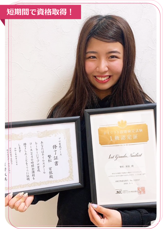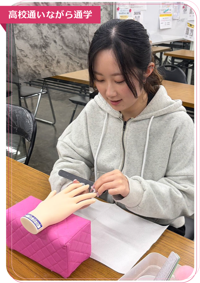 憧れのネイリストにすぐなりたくて、高校通いながら通いやすいネイルスクールを探しました。手ぶらで通えるスクールなので、毎回高校帰りにスクールに通っていました。