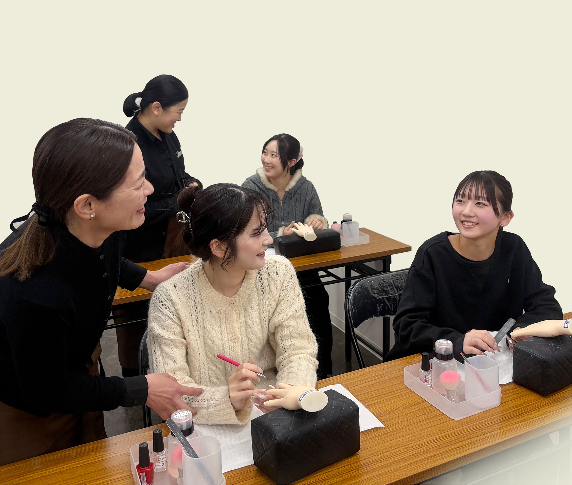 - 上期・全てをサポート。ネイルを初めて学ばれる方がプロネイリストとして活躍できる技術レベルまでの内容の濃いコース。卒業後もしっかりサポート致します。